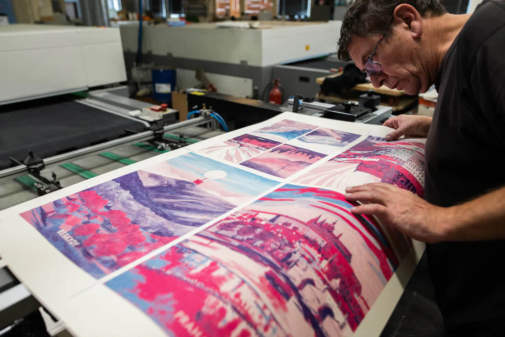Poustre vyrábame na veľkých sieťotlačových strojoch, ktoré si ešte pamätajú éru Československa. Objavili sme ich pri náhodnej návšteve tlačiarne a vrátili im nový život. Každý Poustr je tak nielen dizajnovým originálom, ale aj oslavou poctivého remesla.